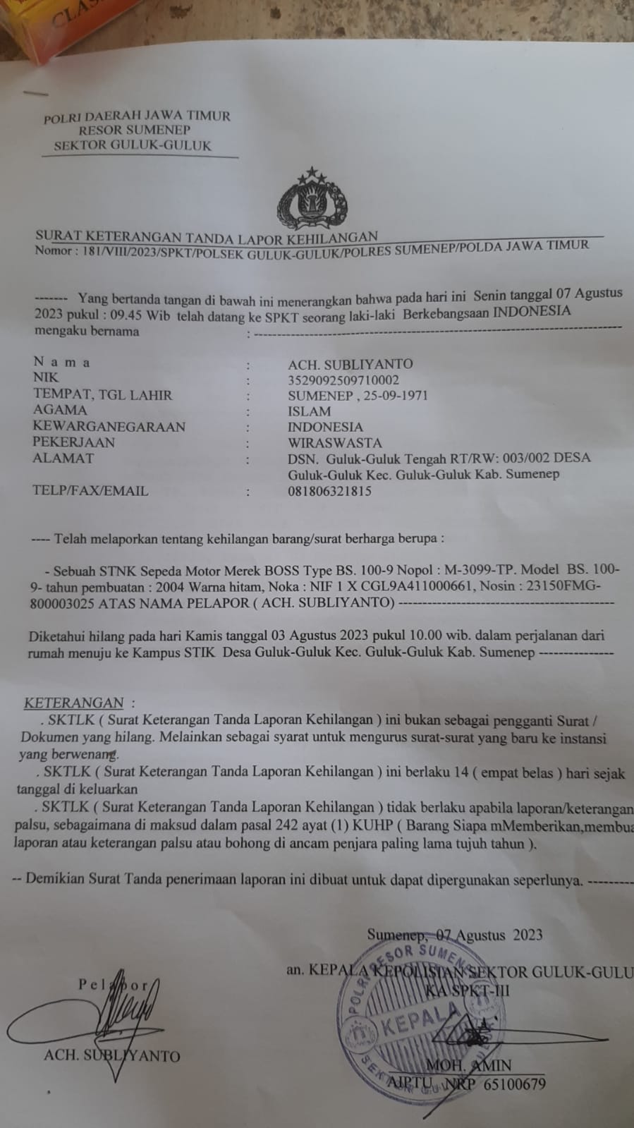 SUMENEP, Lacak.co.id – Berita kehilangan dialami oleh saudara Ach. Subliyanto warga Dusun Guluk-Guluk Tengah RT/RW: 003/002 Desa/Kecamatan Guluk-Guluk, Kabupaten Sumenep, kehilangan STNK Motor Merek BOSS Type BS. 100-9 dengan nomor polisi : M-3099-TP. Model BS. 100-9- tahun pembuatan : 2004 Warna hitam, Noka : NIF 1 X CGL9A411000661, Nosin : 23150FMG-