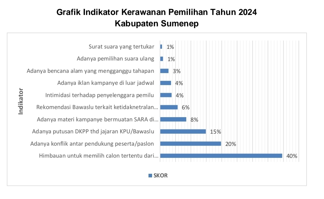 Berikutnya dijabarkan menjadi 61 indikator. Dari hasil pemetaan, ada sepuluh (10) indikator kerawanan yang berpotensi terjadi dalam pelaksanaan Pemilihan Tahun 2024 di Kabupaten Sumenep, yakni: