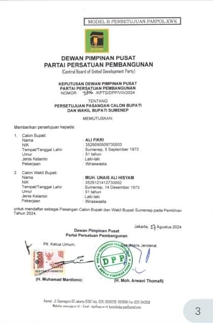 Kemudian juga telah terbit salinan surat Model B Persetujuan Parpol KWK – Surat Keputusan DPP PPP Nomor : 3806/KPTS/DPP/VIII/2024. Tentang Persetujuan Calon Bupati dan Wakil Bupati Sumenep, ditandatangi bermaterai.