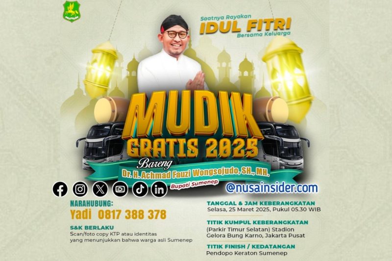Program bertajuk “Mudik Gratis Bareng Bupati Sumenep 2025” ini diinisiasi langsung oleh Bupati Sumenep, Dr. H. Achmad Fauzi Wongsojudo, SH., MH.