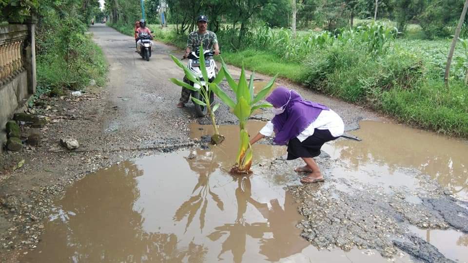 SUMENEP, Lacak.co.id – Foto warga Desa Lobuk, Kecamatan Bluto, Kabupaten Sumenep, Madura, Jawa Timur, menanam pohon kunyit di tengah jalan viral di media sosial, Kamis (24/3/2022).